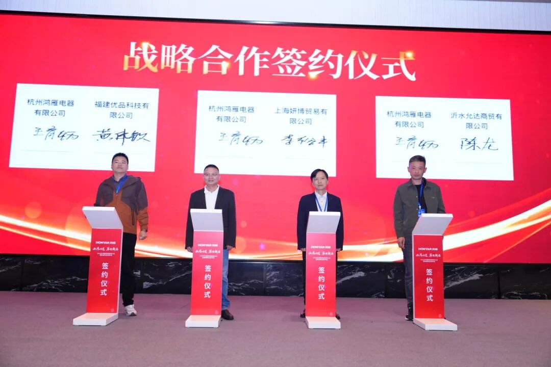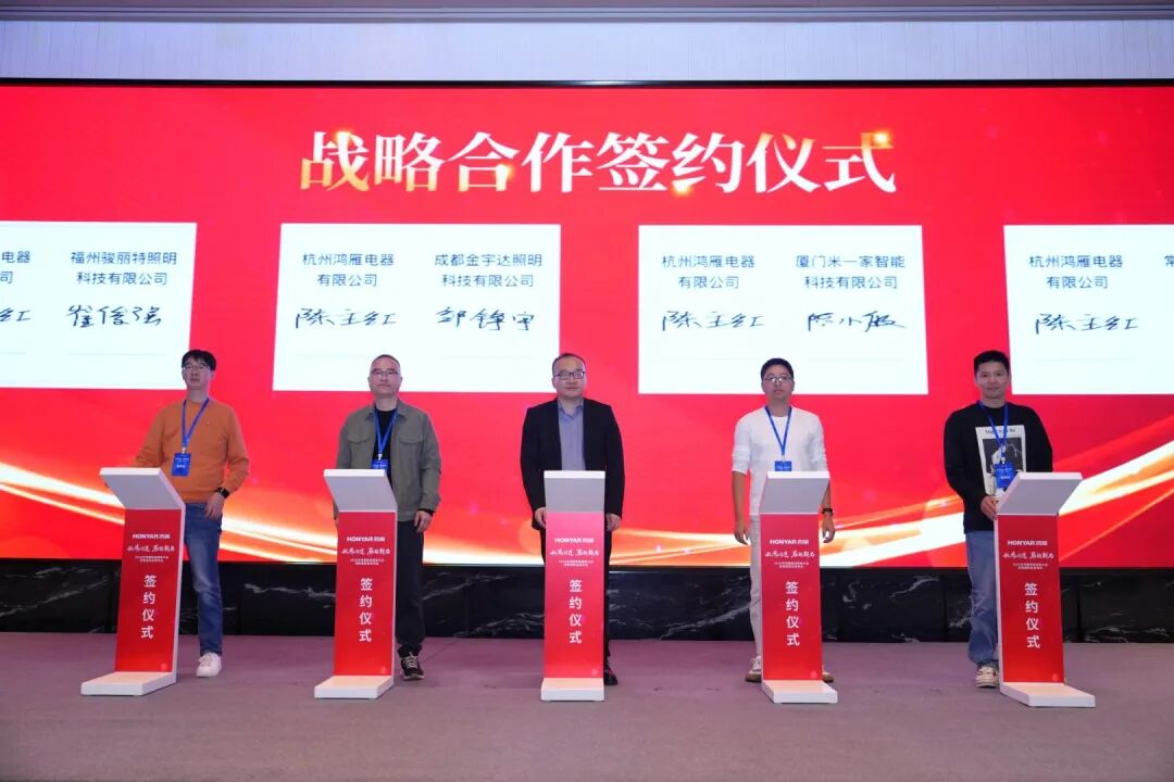 当天下午,新客户签约环节将会议推向了第二个高潮,福建优品科技,上海妍博贸易,沂水允达商贸,福州骏丽特照明,成都金宇达照明,常州企盾照明,临沂正派商贸、厦门米一家、西安利凯、甘肃茂益等十几家实力企业与鸿雁正式签约,这标志着双方自此开启了合作的新篇章,同时也表明鸿雁2025渠道拓展计划迈出坚实一步。