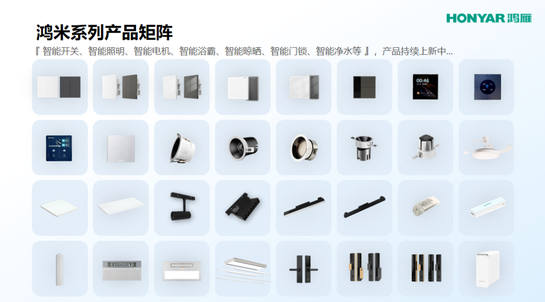 鸿雁精准捕捉到这一窗口期,全面接入米家生态,围绕场景化需求构建爆品矩阵与系统解决方案,推出覆盖智能开关、照明、窗帘电机、浴霸、晾衣架、智能门锁等全品类产品的“鸿米系列”。